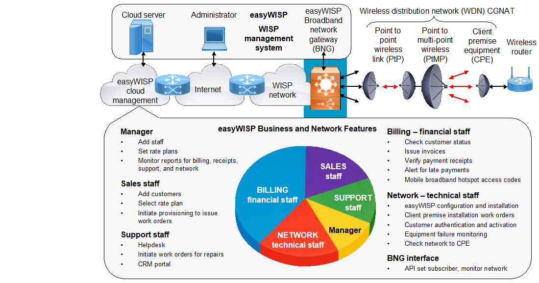 The easyWISP cloud management system includes order entry, billing, workflow, network management, helpdesk and CRM. The cloud automates the management of the easyWISP Broadband Network gateway (BNG) that provides access control; subscriber authentication, rate plan management and billing control. easyWISP is very intuitive and easy to use so staff training is minimized, and is very reliable with redundant features and network failure alerting.
